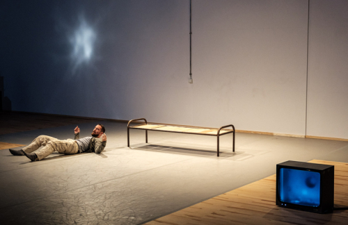 Auf beschränktem Raum entfaltet sich die Dynamik widersprüchlicher innerer Welten. Alle Dynamik bricht sich in, an, um den Körper, der Raum bleibt ruhig – Elemente zur Kontextualisierung verorten den Tänzer situativ, provisorisch in einem speziellen Moment der Zeit, der Erinnerung an Filme, Bilder, Situationen…